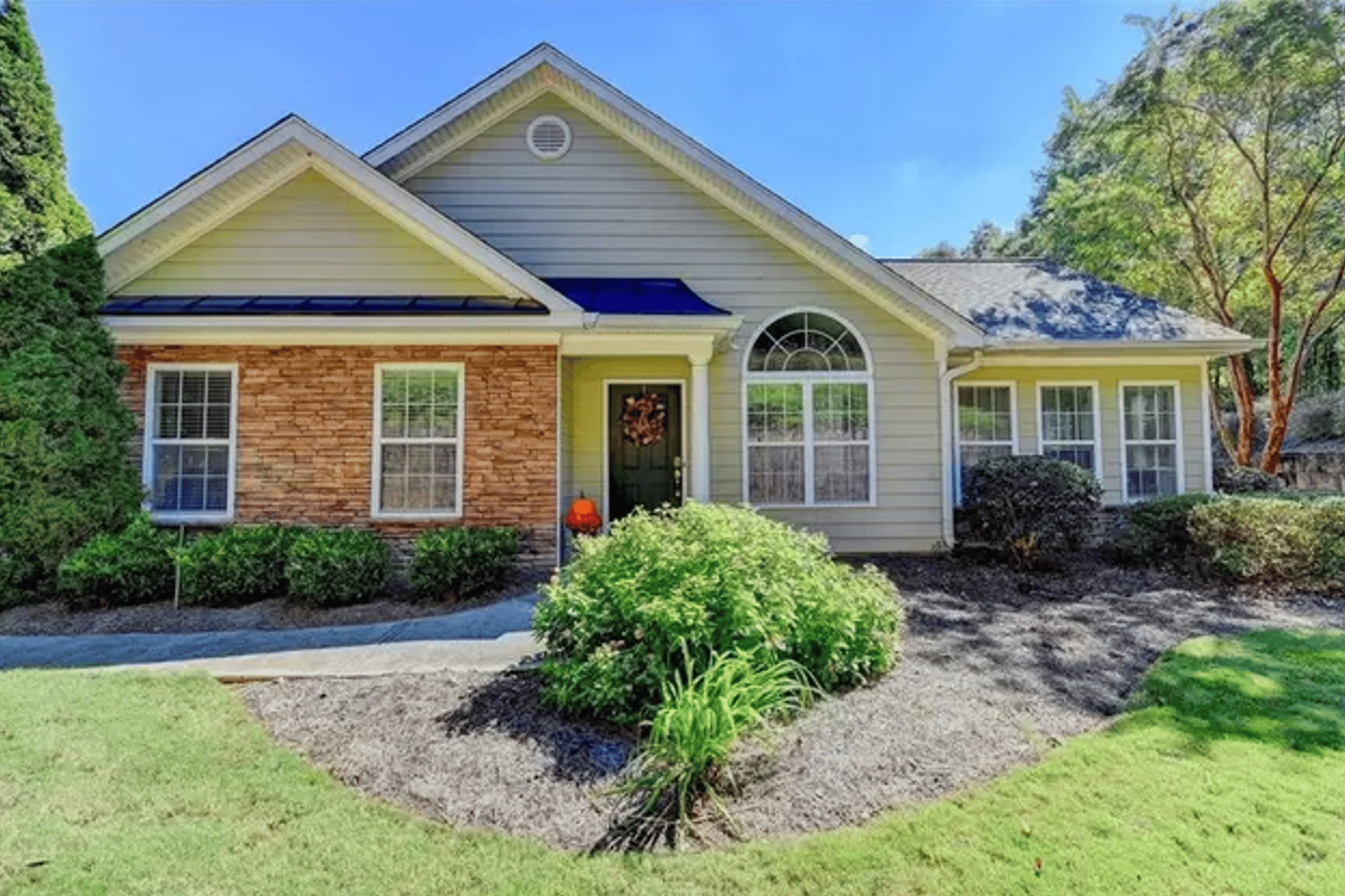 Sought-after one level living in Newbury Village. 3-bedroom 2-full baths ranch duplex exclusive sought after corner unit. Home features include vaulted living room with cozy fireplace and built-in cabinets. Natural sunlight throughout especially the multipurpose bead board paneled sunroom; use as a sitting area, office, music room, library.....you choose. White kitchen comes with refrigerator. Newer LVP water resistant floors throughout main area. New carpet in bedroom. Spacious Owner's Suite with vaulted ceiling, private bathroom and walk-in closet. Large laundry room with sink and Washer & Dryer include! Sunlight floods this move-in ready home. Two car garage provides extra storage plus pull downstairs to attic. Whole house water filtration system. Corner lot provides green space surrounding the home and pergola covered courtyard. Amenities complete with clubhouse, social events, pool, tennis and pickle ball. HOA dues also include termite, lawn care and exterior maintenance. Just look up to see the incredible view of Sawnee Mountain as you drive out of the neighborhood. Very few units ever go up for sale.